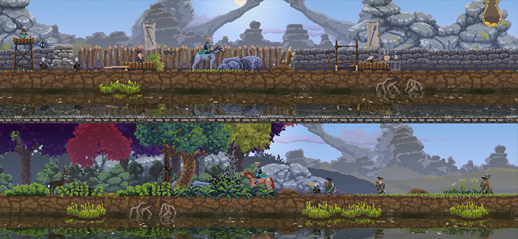 《王国两位君主-Kingdom Two Crowns》是一款横向卷轴微型策略游戏,游戏风格简约,但又不失精美的现代像素艺术美感。玩家将扮演一位君主,骑上自己的骏马,招募忠诚的臣民,建立自己的王国,保护它免受贪婪的生物的侵害,这些生物试图窃取您的金币和王冠。