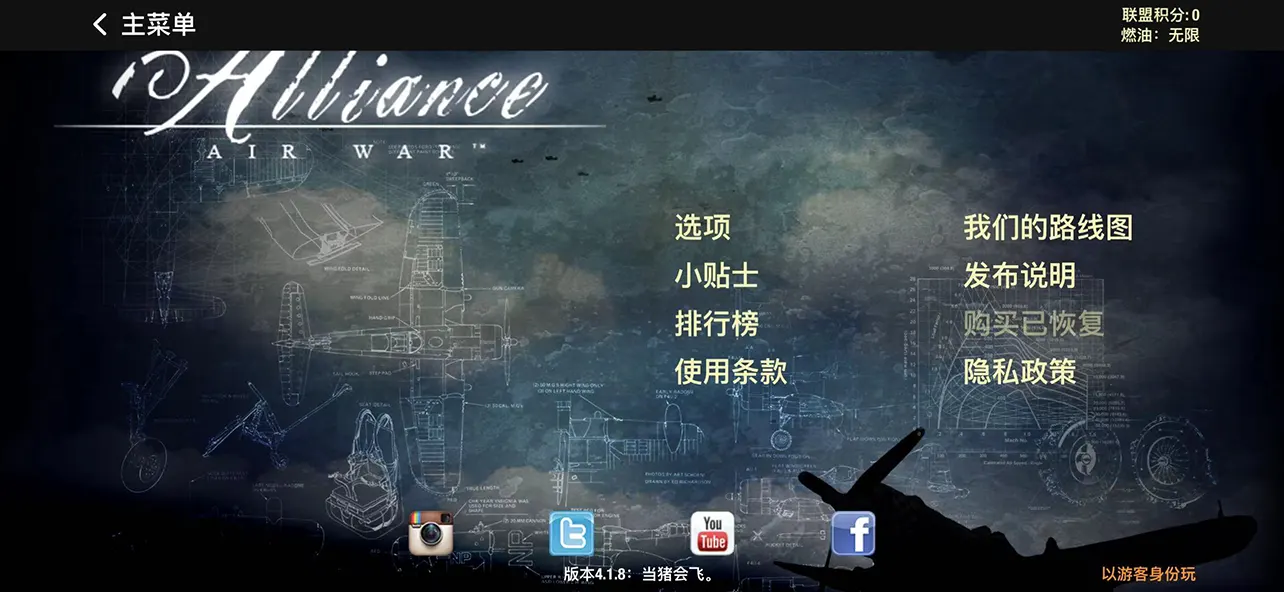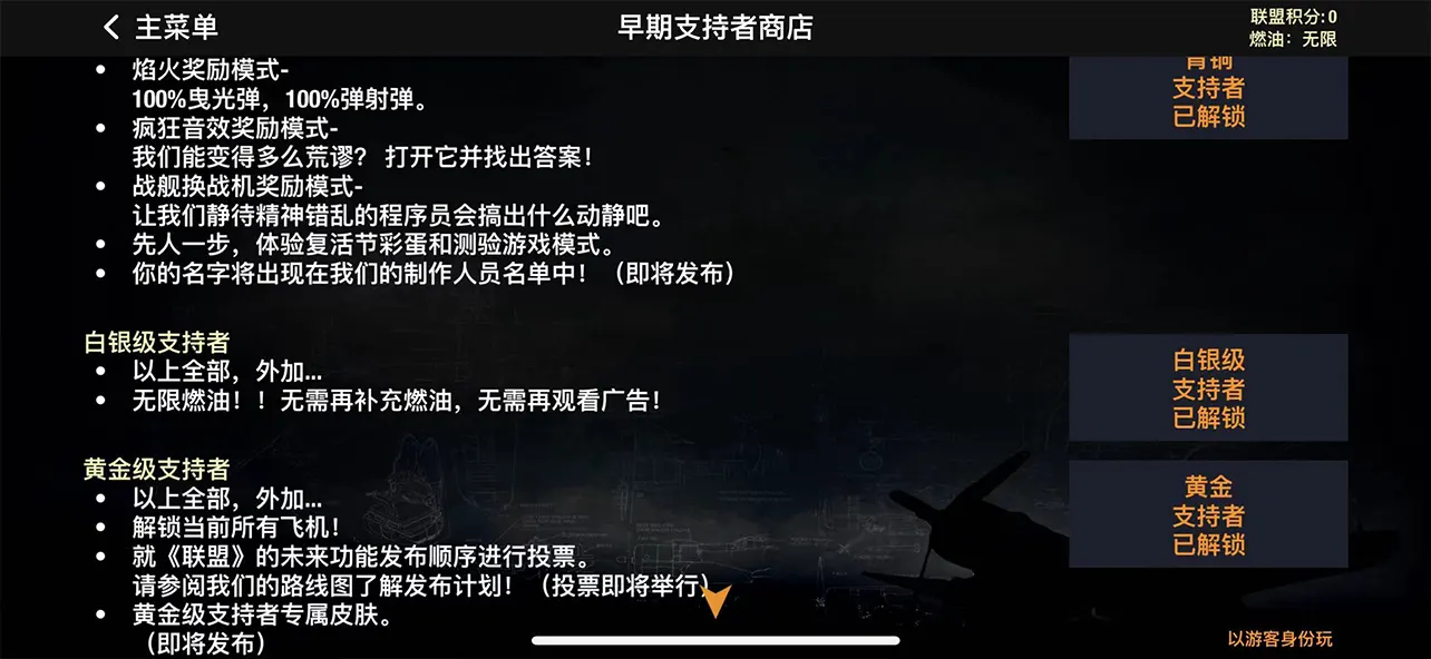 • 已解锁黄金支持者内购dlc(全部飞机、无限燃油),但不包含飞机皮肤、飞机升级项目